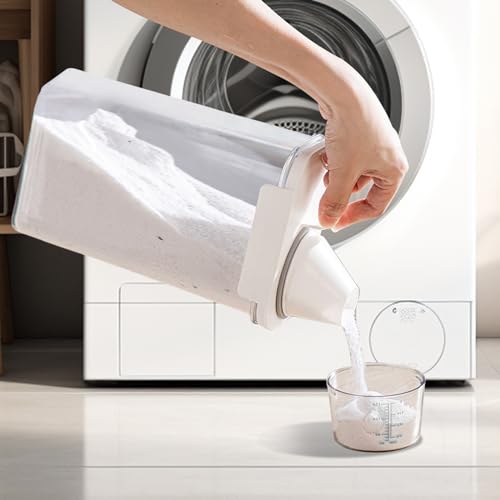 • Ergonomisches Design: Die Waschpulver behälter waschmittelspender 2300ml hat eine obere breite Form, die sich angenehm in der Hand anfühlt, und wird nach unten schmaler. Rillen auf der Flasche verhindern ein Abrutschen, auch wenn die Hände nass sind. Die Handhabung ist einfach, und dein Waschraum bleibt immer aufgeräumt.