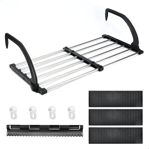 - Einziehbarer Wäscheständer: Der hängende Balkontrockenständer kann von 43-73cm/16.53-28.74inch erweitert werden. Es ist groß in der Größe und kann frei erweitert werden. Sie können mehr Kleidung oder Schuhe auf einmal trocknen. Nach dem Gebrauch kann es leicht in ein flaches Rechteck für einfache Lagerung gefaltet werden, ohne Platz zu nehmen