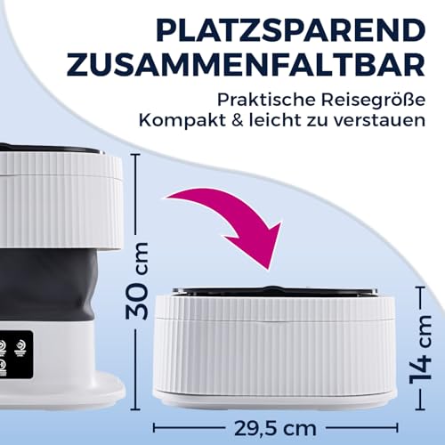 - PLATZWUNDER: Die Mini-Waschmaschine ist ein echtes Platzwunder! Sie lässt sich platzsparend zusammenfalten und bequem verstauen, sodass sie perfekt für kleine Wohnungen, Reisen, Hotels, Camping-Touren und Studentenwohnheime geeignet ist.