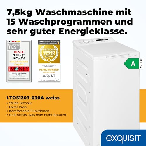 Exquisit Toplader Waschmaschine | 7,5 kg Kapazität, Energieklasse A, 1200 U/Min, 78 dB(A) | schmale Bauform, 15 Programme, Eco 40–60, Kurzprogramm, Startverzögerung, Aquastop | LTO51207-030A weiss
