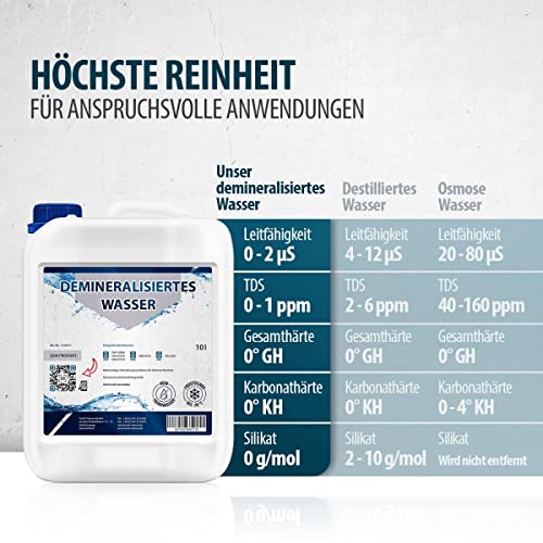 - HOHE QUALITÄTSPARAMETER: Leitfähigkeit 0 – 2 μS, TDS 0 – 1 ppm, Gesamthärte 0° GH, Karbonathärte 0° KH, Silikat 0 g/mol.