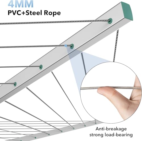 - ✅【Militärisch Robust – Wetterfest & langlebig】Verstärkte 4CM Edelstahlstange – wasserdicht, windfest, rostfrei und extrem stabil. 4mm extra dicke wäscheleine mit Metallkern und UV-beständiger PVC-Ummantelung – reißfest und dauerhaft.