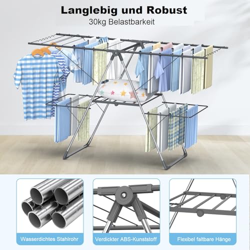 - 👗Multifunktionale Trocknungslösung: 3 höhenverstellbare Ebenen für Mäntel, Anzüge und Longwear; 3 verstärkte Querstangen mit XXL-Fläche für Decken, Handtücher und Schuhe; Kombinierbare Aufhängung für alle Textilarten.