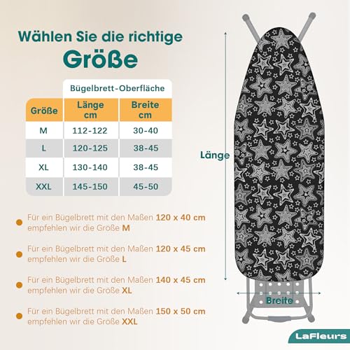 • EINFACH ZU VERWENDEN & PERFEKTE PASSFORM: Unser Bügelbrettbezug ist in 4 Größen erhältlich – bitte sehen Sie sich das Bild zur Größenauswahl an, um die passende Größe für Ihr Bügelbrett zu finden. Der LaFleurs Bügelbrettbezug lässt sich fest auf Bügelbrettern in verschiedenen Formen anbringen, ganz ohne Faltenbildung