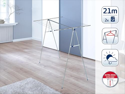 • Viel Platz – Auf insgesamt 21 m Wäscheleine können an diesem Leifheit Wäscheständer mehr als zwei Waschmaschinenladungen und auch lange Wäsche aufgehängt werden