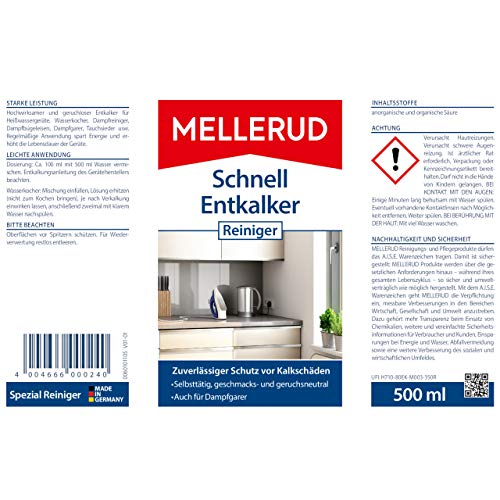 - Lieferumfang: 1 x 0,5 l MELLERUD Schnell Entkalker Reiniger / Entkalkt schonend sowie geschmacksneutral und verlängert die Lebensdauer des Geräts / Auch für Dampfgarer geeignet