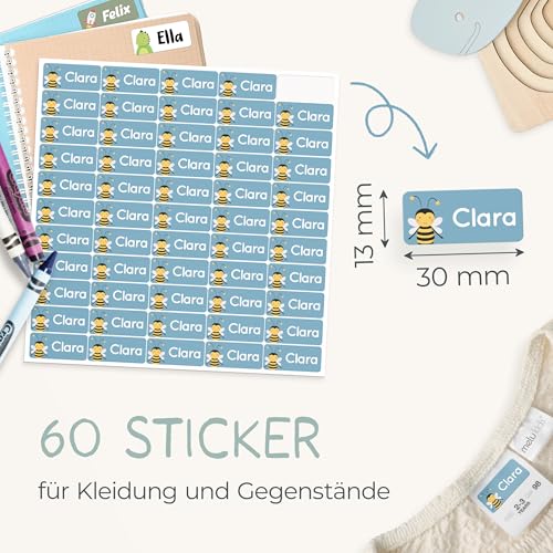 melu kids® Namensaufkleber für Kinder – Kleidung & Gegenstände (60 Stück) Kita/Schule – Namensschilder für Kleidung waschmaschinenfest und personalisiert (blau)