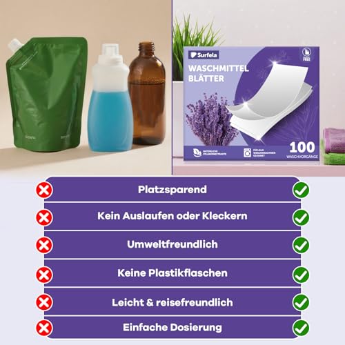 Surfela Waschmittel Blätter Lavendel –bis zu 100 Waschgänge (100 Blätter) Nachhaltige, Biologisch Abbaubare Waschblätter für die Waschmaschine – Reisewaschmittel, Umweltfreundlich & Platzsparend
