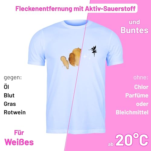 Kraftvoller Fleckenentferner Kleidung – Entfernt selbst hartnäckige Flecken wie Rotwein, Blut, Öl oder Gras effektiv. Die Formel mit aktivem Sauerstoff wirkt bereits ab 20 °C, ist chlorfrei, ohne Parfüm, und schont Farben und Fasern.
