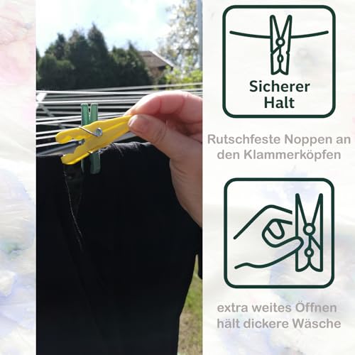 - Rutschfester Griff mit Noppen – sicher auch bei feuchten Händen Jede Klammer ist mit strukturierten Griffzonen ausgestattet, die ein Abrutschen verhindern. Für zuverlässigen Halt auch bei Wind, Nässe oder schwereren Textilien.