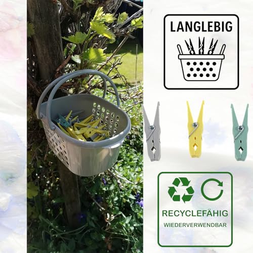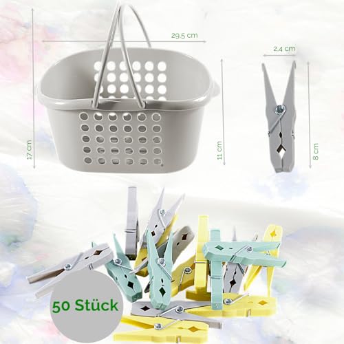Wäscheklammern Set mit Klammerkorb | 50 stabile Wäscheklammern mit rutschfestem Griff | UV-beständig, farbecht, BPA-frei | Klammerkorb mit Henkeln & Belüftung | Wäschezubehör aus Kunststoff