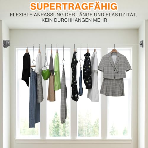 【Anti-Durchhänge-Design】 Diese ausziehbare wäscheleine verfügt über ein einstellbares Spanngetrieb, durch einfaches Drehen und Festlegen können Sie die Spannung der Schnur nach Bedarf leicht einstellen, um das Durchhängen aufgrund des Gewichts der Kleidung effektiv zu verhindern.