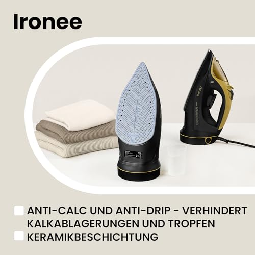 Dank der Leistung von 2600 W ist das Ironee-Modell äußerst effizient und heizt schnell auf. Die Sohle des Bügeleisens ist mit einer Keramikbeschichtung versehen und garantiert somit ein seidenweiches Bügeln ohne Falten. Dank einem Dampfausstoß von 30 g/min ist auch vertikales Dampfbügeln möglich