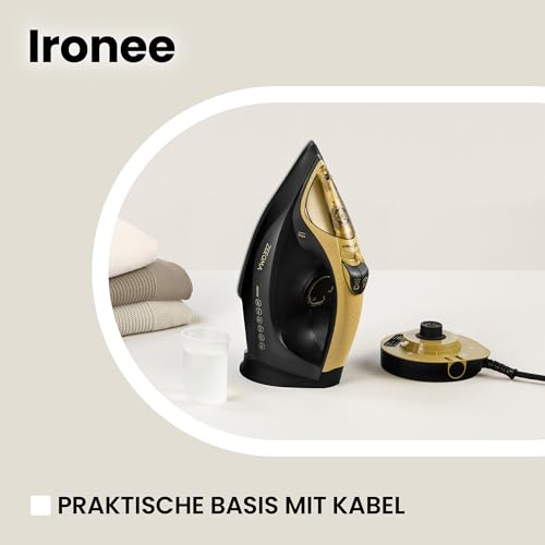 - KABELLOSES BÜGELEISEN: dank der Leistung von 2600 W ist das Ironee-Modell äußerst effizient und heizt schnell auf. Die Sohle des Bügeleisens ist mit einer Keramikbeschichtung versehen und garantiert somit ein seidenweiches Bügeln ohne Falten. Dank einem Dampfausstoß von 30 g/min ist auch vertikales Dampfbügeln möglich